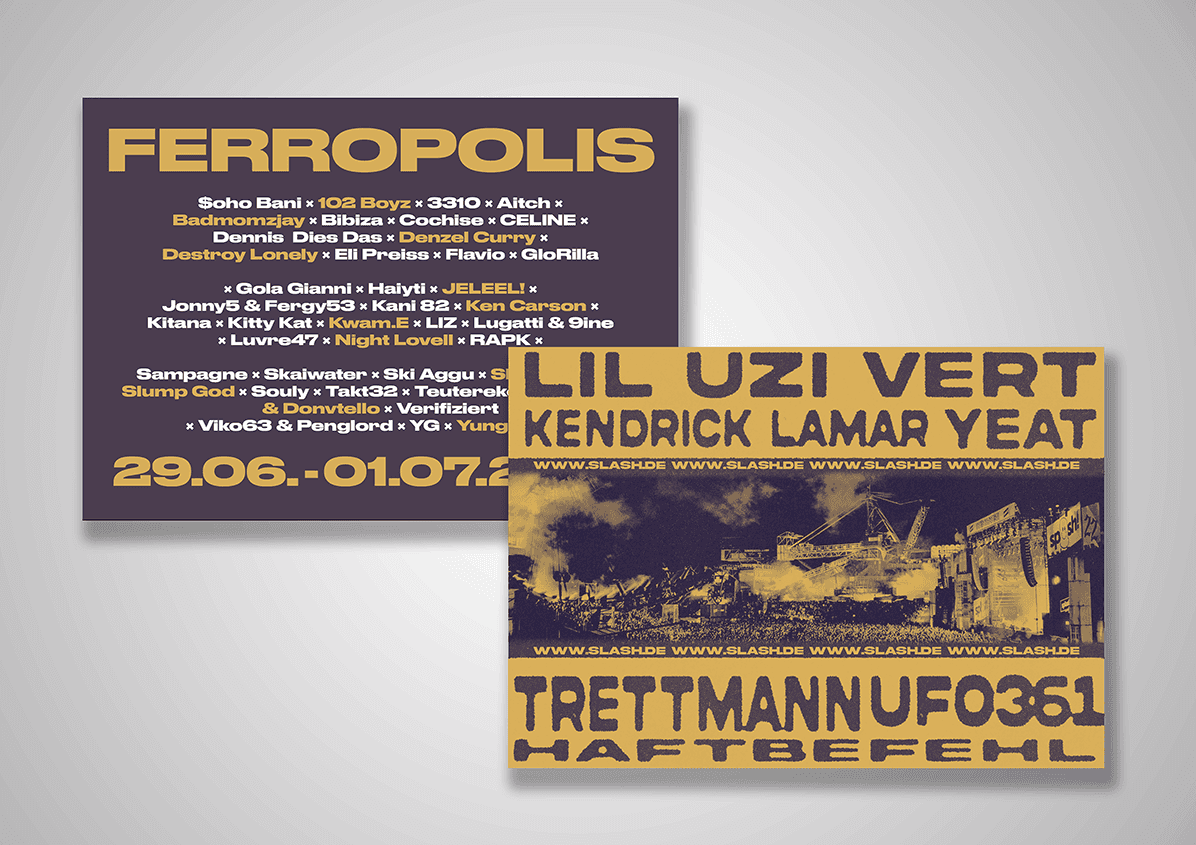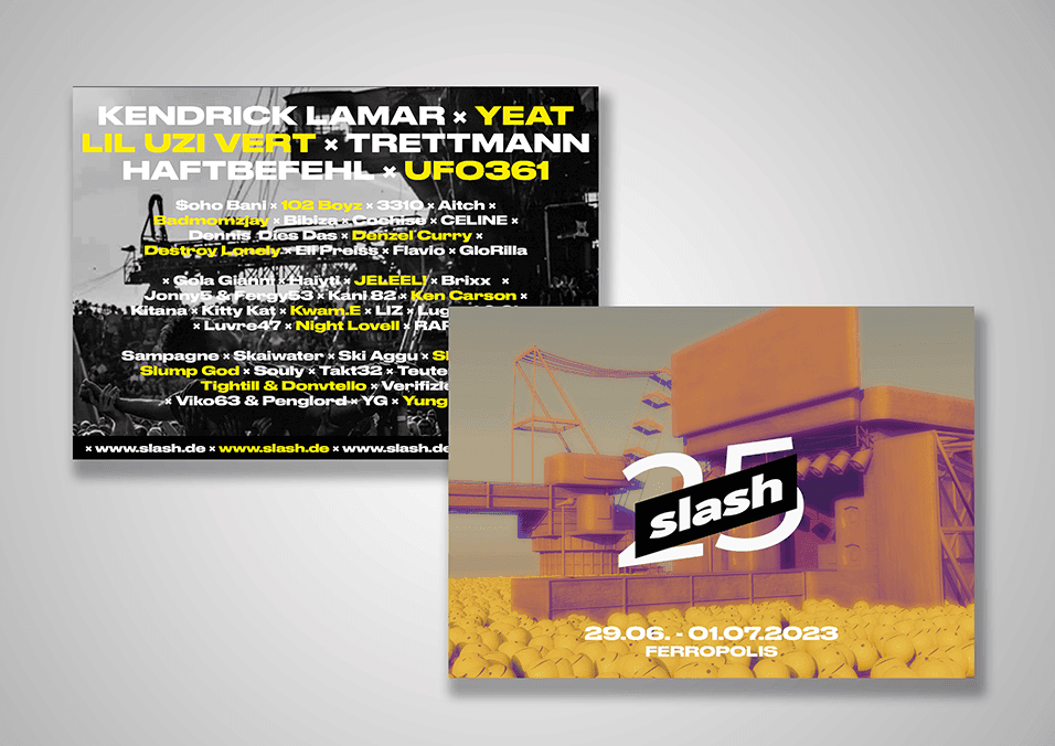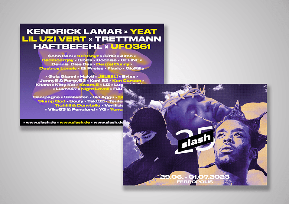 Neben Kundenprojekten gestalte ich regelmäßig aus eigenem Antrieb. Diese Flyer und Poster sind für das fiktive "Slash" Festival und den Anfachen Award VII entstanden, ohne Briefing und ohne Auftrag.